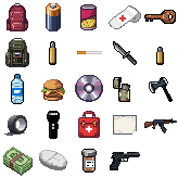 A pack of free 25 pixel art items for a survival/post-apocalyptic game world.